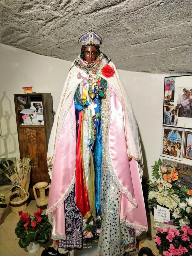 After we’d had our fill of birds, we popped over to the town of Saintes-Maries-de-la-Mer (Saints Marys of the sea. Yes, plural) for a look around and lunch. Legend has it that the three Marys who were present when Jesus’ tomb was opened headed out sometime afterwards on the high seas, landing here and living out the rest of their lives in the Camargue. As the story goes, they were assisted ashore by Saint Sarah, who is the patron saint of the Roma people. But Sarah as a Christian saint is most likely derived/borrowed from the Hindu goddess Kali, and her veneration probably came along with the Roma who are originally from Northern India. The Romani people make a massive pilgrimage to this small town every year for a ceremony in which church officials take Sarah’s effigy and the chest that purportedly contains the bones of the Marys (miraculously “discovered” in the 15th century) from the niche above the altar out to sea and back in again.