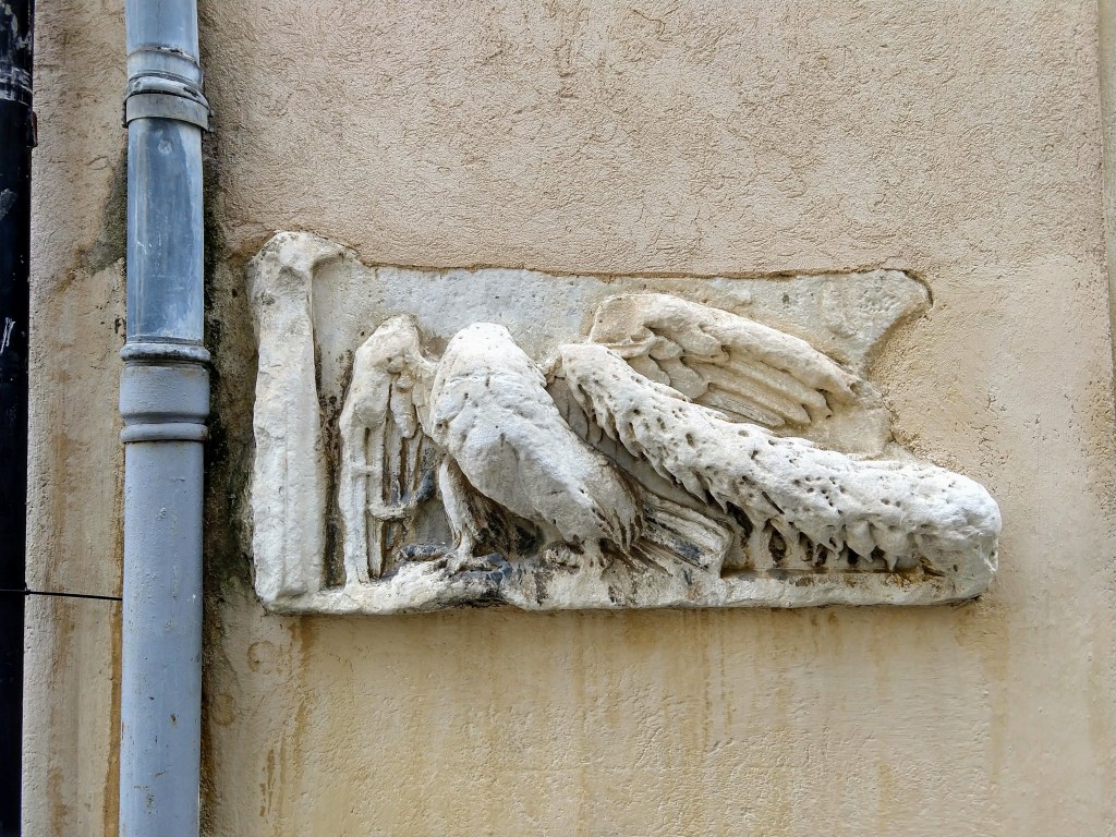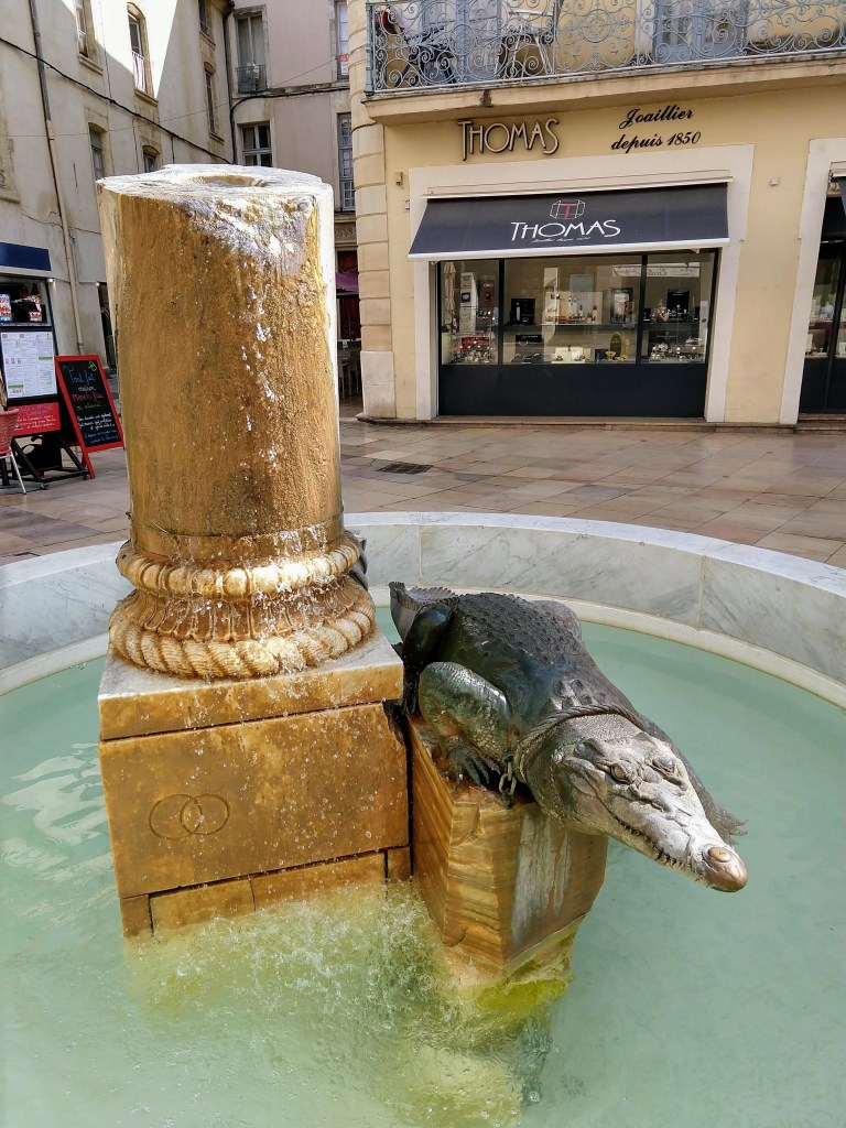 The emblem of Nîmes is a crocodile chained to a palm tree and you see it everywhere. The common explanation is that the legionnaires of Octavius’ army were given this land as a reward for conquering Egypt by defeating Anthony and Cleopatra. The crocodile, symbolizing Egypt, is now chained. A colorful story, but probably false. Major Roman military events were publicized and celebrated by the minting of coins, and true, this was the symbol for this victory. The coins were struck on the reverse with an abbreviation for the colony of Nîmes and so the connection between the city and the conquest was made. However, Nîmes was simply where the mint was located, no legionnaires were given land here. These coins were frequently found anytime someone dug up the ground in Nîmes and that’s why the symbol was adopted for the city some time later.