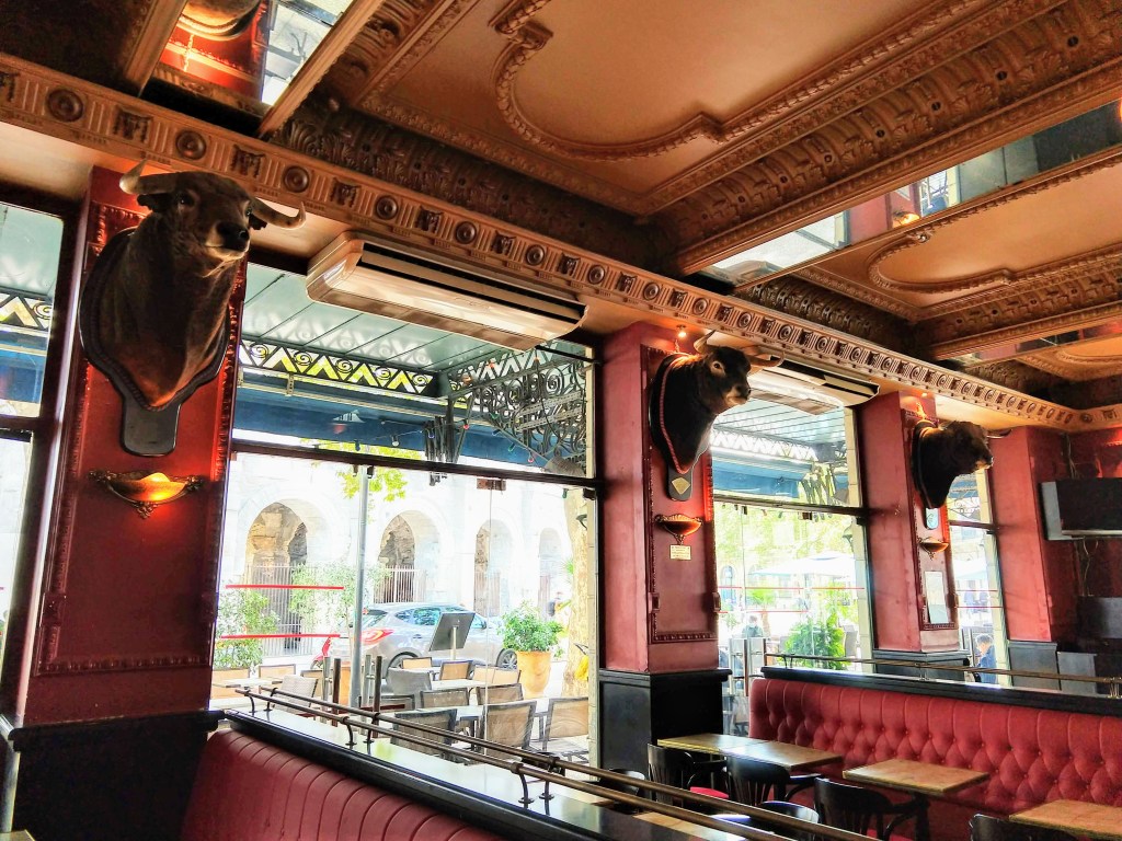 Bullfighting still takes place in the arena, the Spanish style which ends in the death of the bull. The Provence style is where ribbons are attached to the horns and young men try to grab them off and leap to safety, which, while more humane, is no doubt annoying as all get out if you’re a bull. Bullfighting is illegal in France, except when there is an unbroken tradition. Nîmes is one of those places, though I just read about the Animalist Party who is trying to put an end to it.