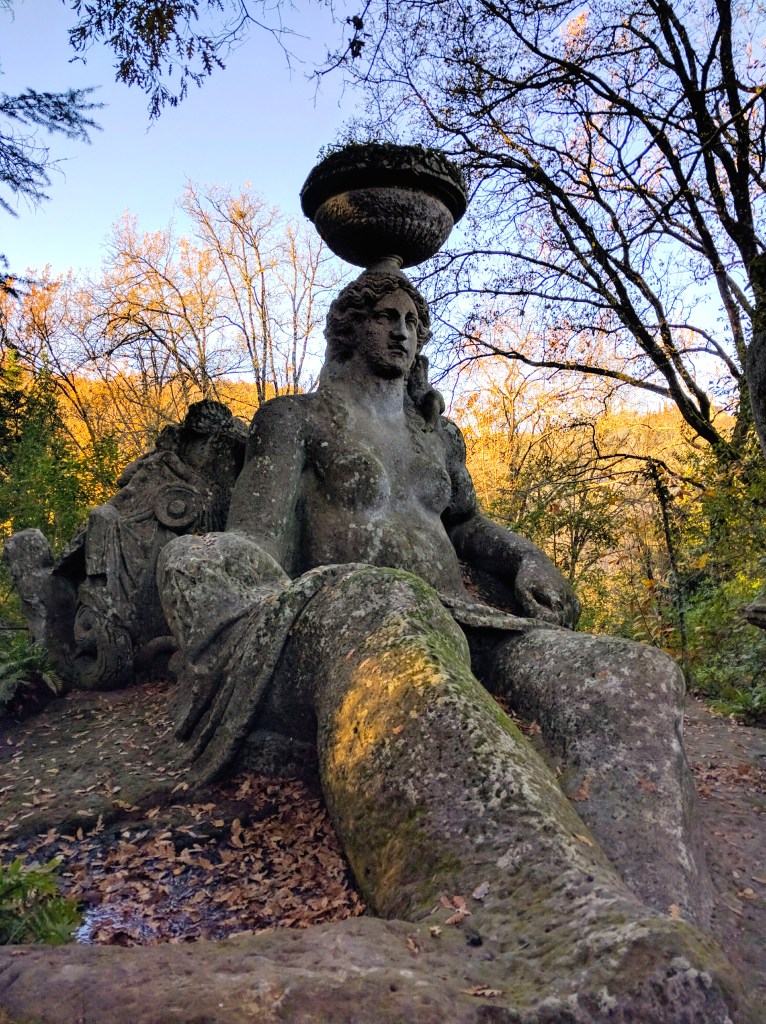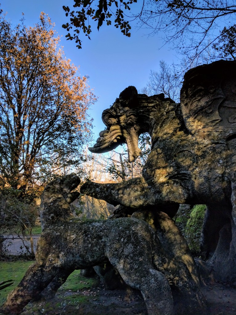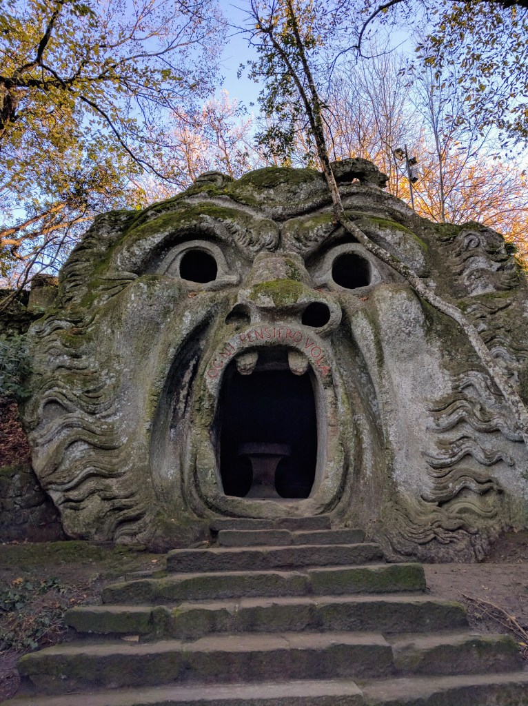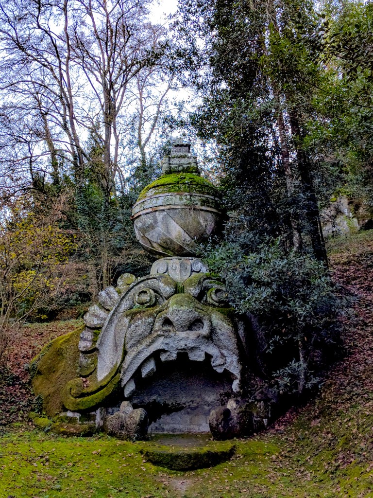 What the hell is Monster Park? It’s a 16th century sculpture park/garden near Viterbo, that was commissioned by a great patron of the arts as a place of consolation after his beloved wife’s death. It was done in the Mannerist style, which is what art became after everyone got sick to death of the stifling symmetrical classicism of the High Renaissance. Which basically means art got weirder and a lot more fun. Then it fell into decay (the park, not Mannerism), and that must have made it all the more delicious, spooky, and surprising for anyone stumbling upon it. Dali made it famous in a short film and then in a painting in the 1950s, and afterwards the park was renovated and reborn as a tourist attraction. Without further ado: Monster Park!