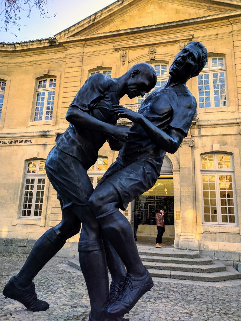But what is thrilling about Avignon is the number of artists living there. It’s the home of an extensive and famous summer theater festival, sadly canceled last year and probably this one as well. There’s a good number of visual artists too. Mark and I attended a studio walk and not only got to see some terrific work, but we also got to peer into people’s homes and work spaces which was every bit as interesting as their art. It would have been rude to photograph their work so I’ll just show you a sculpture from outside the fine arts museum.