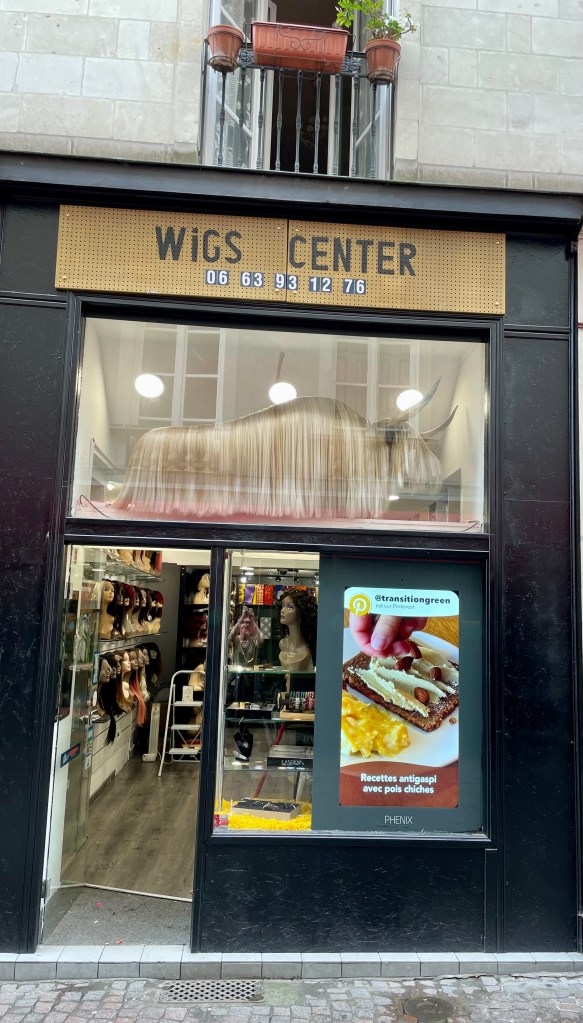 But then on our last day, after we were frustrated and thwarted in our attempts at lunch, we crossed the tracks to a small neighborhood we thought we’d already seen. We immediately felt more at home in the narrow streets. It appeared to be an immigrant neighborhood, and finally, there were things to marvel at, like how this wig shop has outfitted the neighboring mascots in fabulous hairdos.