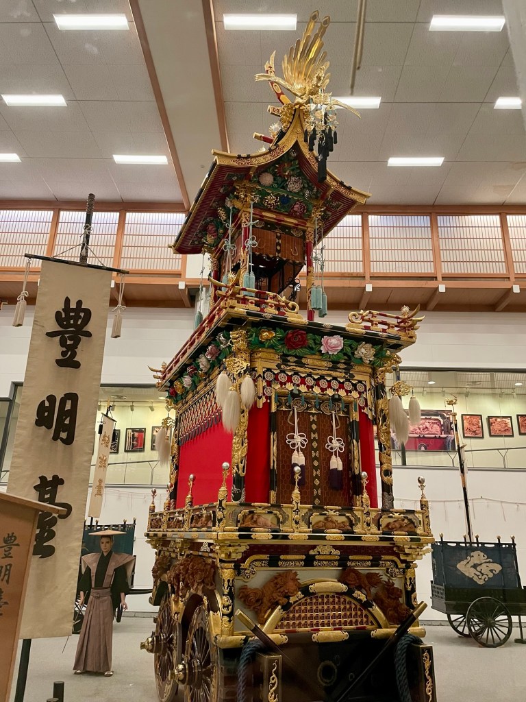 Takayama is best known for its spring and fall festivals which date from the mid 1600s, featuring 11 floats which parade through the streets at nightfall. Richly decorated and lit up with lanterns, they proceed very, very slowly by human power. It’s considered one of the most beautiful festivals in Japan. But if you’re unwilling to brave the crush of the festival or can’t get a hotel room during that time, the floats are displayed in a very tall ceilinged museum year round. Or rather 4 at a time are displayed, on a rotating schedule. You’ll have to come back every 4 months if you want to see them all.
